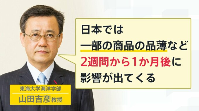 東海大学の山田吉彦教授(海洋学部)のお話では、「日本では一部の商品の品薄など、2週間から1か月後に影響が出てくる」と言います。