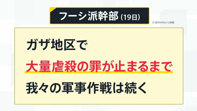 しかし、フーシ派の幹部は12月19日、「ガザ地区で大量虐殺の罪が止まるまで、我々の軍事作戦は続く」と、X(旧Twitter)で投稿しています。戦争が続いている限り、フーシ派は攻撃を続けるということを示しているわけなんです。