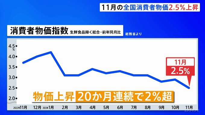 先月11月の全国の消費者物価指数は去年より2.5%上昇しました。一方で、伸び率は2か月ぶりに縮小しています。物価の変動を示す11月の全国の消費者物価指数は、天候の影響をうける生鮮食品を除いた総合が去年の同じ…