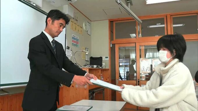 小瀬善浩校長から「友人と喜びを分けあって暖かい冬休みを過ごそう」と話があり、担任からは冬休みの宿題と通知表が配られました。