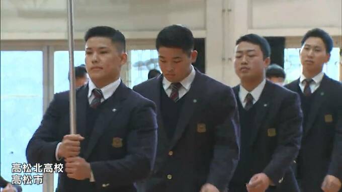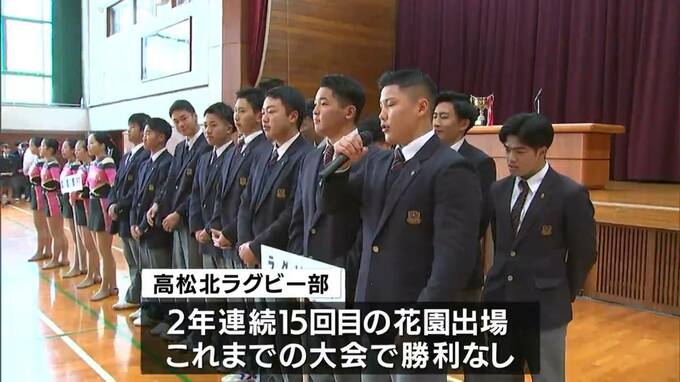 壮行会では、2年連続の花園出場を勝ち取った高松北ラグビー部のフィフティーンが拍手で出迎えられました。全国大会へは15回目の出場となりますが、これまで一度も勝利したことがなく、「今年こそは」とキャプテンの普門選手が必勝を誓いました。