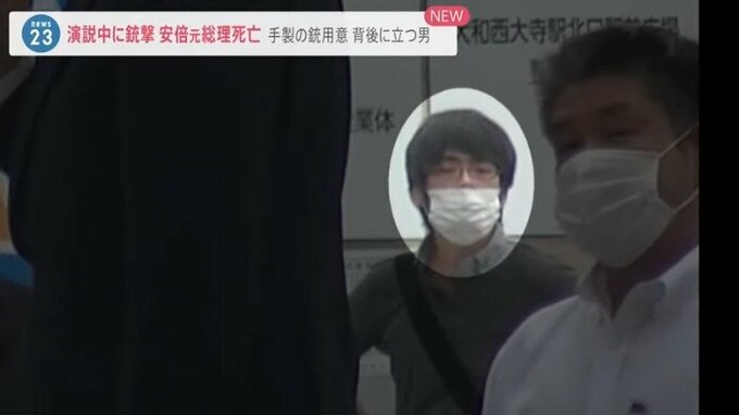 安倍元総理の後方で、演説を聴いているようなそぶりを見せる男の姿が映っています。