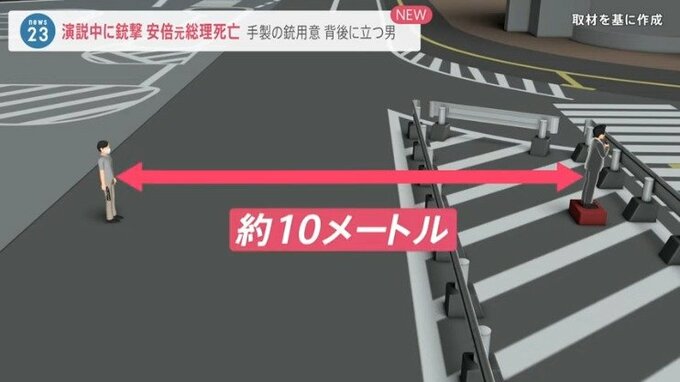 男は、その様子を、道路を一本挟んだところから見ていました。その後、男は安倍元総理の背後に近づき、10メートルほど離れた場所から発砲。銃は2度発砲されたとみられ、2発目の銃弾が首に命中しました。