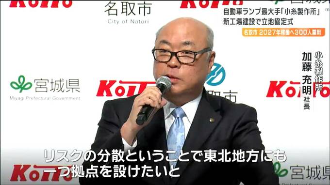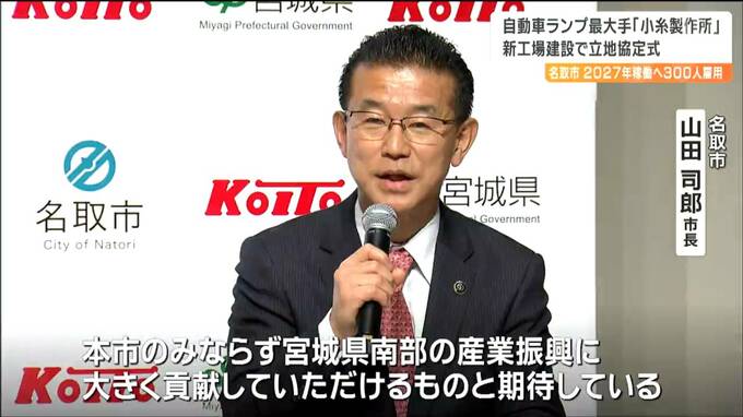 新工場は、愛島西部工業団地に建設予定で用地面積はおよそ7万8000平方メートル、設備投資は100億円を超える見通しです。自動車用のヘッドランプとリアランプをそれぞれ年間50万台製造する計画で、地元を中心に300人程度の雇用を見込んでいます。