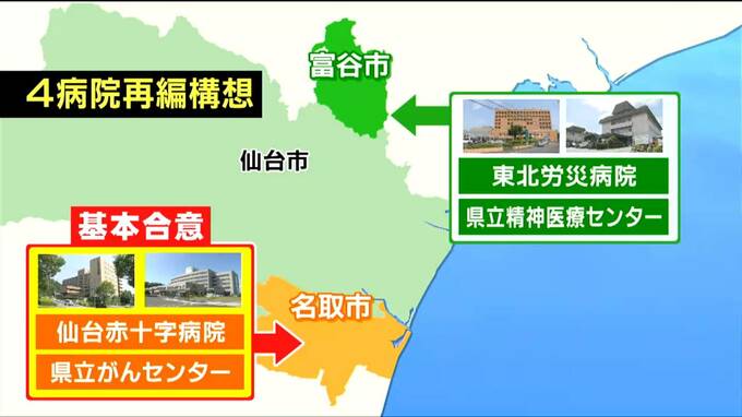 このうち仙台市太白区にある仙台赤十字病院と名取市にある県立がんセンターを統合して名取市に新病院を整備、青葉区にある東北労災病院と名取市にある県立精神医療センターを併設して富谷市に移転し新病院を整備する計画です。
