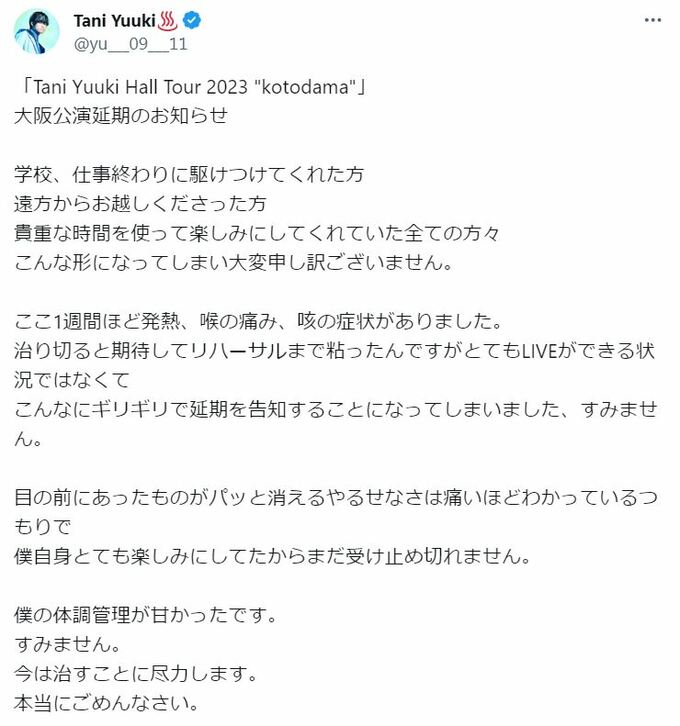 Taniさんは「『Tani Yuuki Hall Tour 2023 "kotodama"』大阪公演延期のお知らせ」と題して「学校、仕事終わりに駆けつけてくれた方 遠方からお越しくださった方 貴重な時間を使って楽しみにしてくれていた全ての方々 こんな形になってしまい大変申し訳ございません。」と深く謝罪。