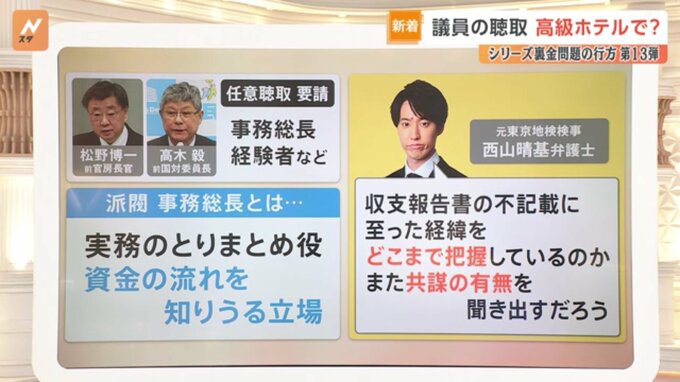 その人物に要請を行った東京地検特捜部の狙いとしては、「収支報告書の不記載に至った経緯をどこまで把握しているのか。また、共謀の有無を聞き出すだろう」と西山弁護士は話しています。