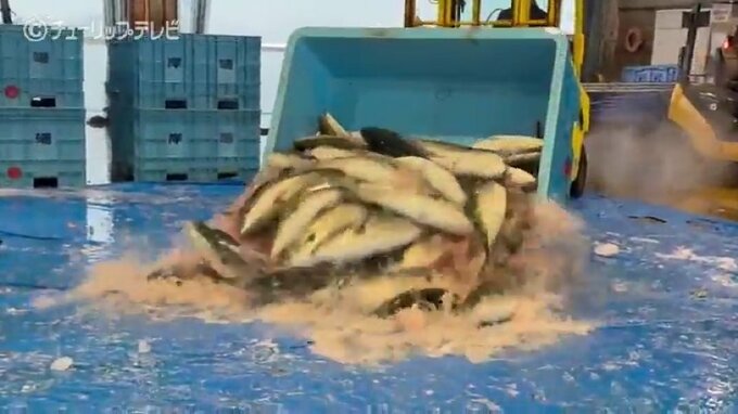 23日、富山県の氷見漁港に水揚げされた丸々太ったブリ。水揚げ量は今シーズン最多の1852本です。