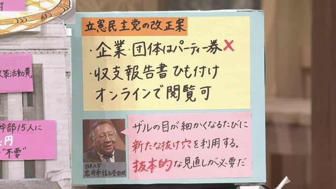 立憲民主党は「企業や団体のパーティー券購入禁止」や「すべての収支報告書をひも付け、オンラインで閲覧できる」ことなどを柱とした改正案を提出。