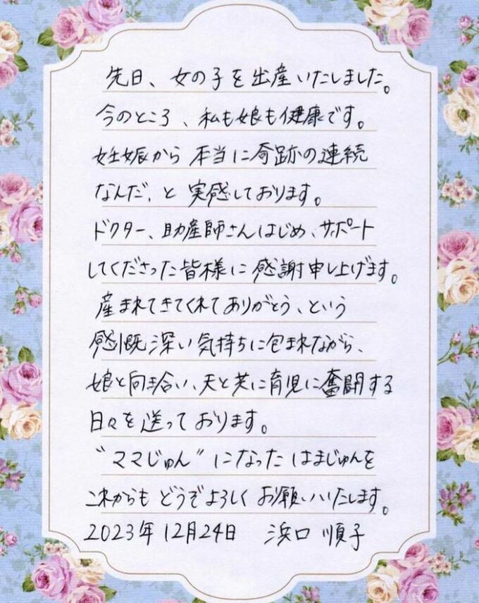 続けて「産まれてきてくれてありがとう、という感慨深い気持ちに包まれながら、娘と向き合い、夫と共に育児に奮闘する日々を送っております。”ママじゅん”になったはまじゅんをこれからもどうぞよろしくお願いいたします。 2023年12月24日 浜口順子」と記しています。