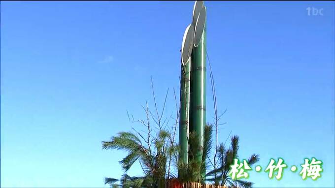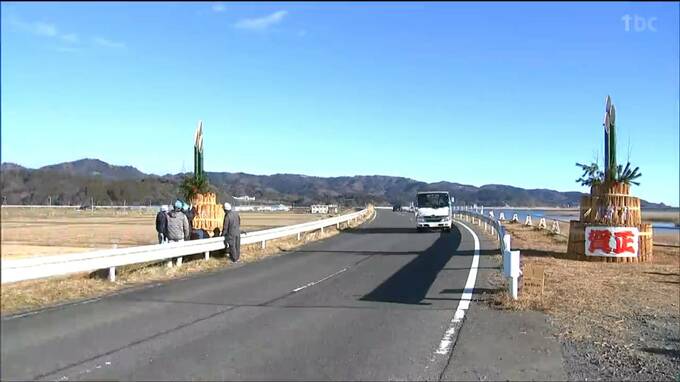 年末年始の帰省や観光で訪れた人を出迎えようと、宮城県石巻市の北上地区に25日、ジャンボサイズの門松が設置されました。