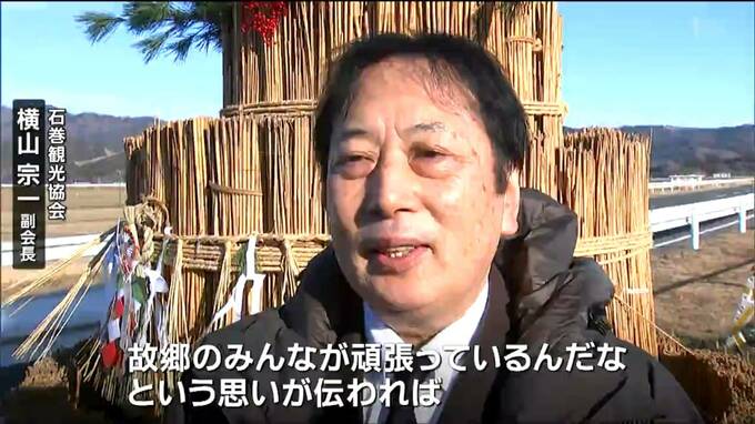 「日本一のヨシ原のヨシを使ったジャンボ門松は北上のシンボル。故郷のみんなが頑張っているんだなという思いが伝われば」