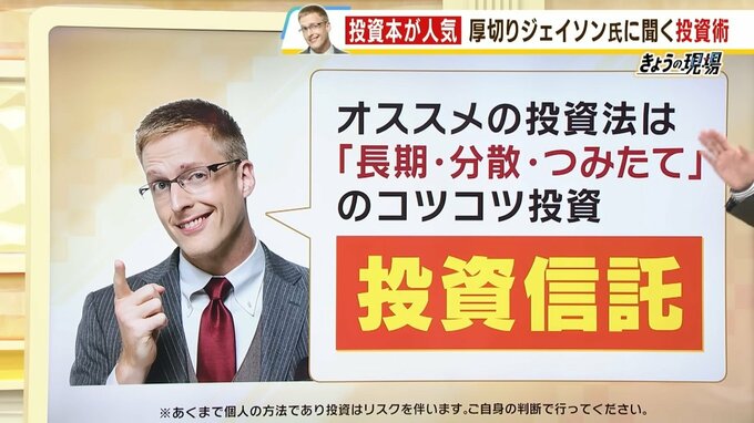 ――節約でできたお金を、ジェイソンさんおすすめの投資法は長期分散積立のコツコツ投資、投資信託がいいんじゃないかと提案されています。