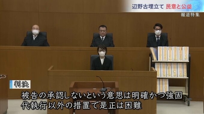 「被告の承認しないという意思は、明確かつ強固というほかなく、代執行以外の措置で是正をはかることは困難である。被告主張の『対話』は、その方法に当たるとはいえない」「最高裁判決で法令違反との判断を受けた後も、これを放置していることは、それ自体社会公共の利益を害するものといわざるを得ない」