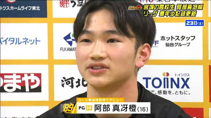 クラブ初のユース育成特別枠選手に指定された阿部真冴橙選手。利府高校に在籍中で中学からナイナーズユースに所属する16歳です。23日土曜のゲーム、残り6秒で登場した阿部選手、B1最年少出場記録を更新するとさらに終了のブザーで…、3ポイント!最年少得点記録も塗り替え喜びを爆発させました。