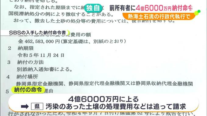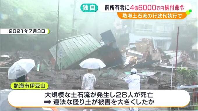 2021年7月の熱海土石流災害で、崩落の起点に残った不安定な土砂を撤去した行政代執行の費用について、静岡県が前の土地所有者に納付を命じていたことが分かりました。その額は、4億6000万円に上ります。