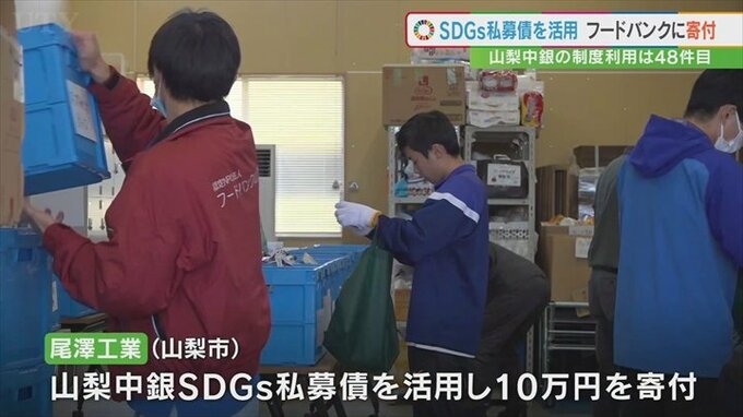 尾澤工業は資金調達のために発行する私募債の額に応じて指定した団体に寄付をする山梨中央銀行のSDGs私募債を活用し、今回フードバンク山梨に10万円を寄付しました。