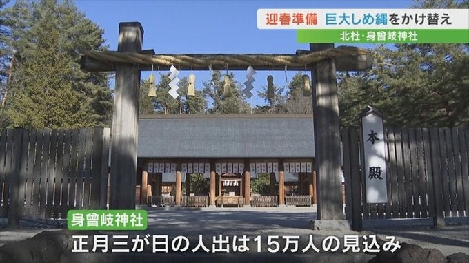 新年の参拝者を迎え入れようと北杜市の身曾岐神社で長さ6mのしめ縄をかけ替える作業が行われました。