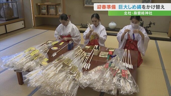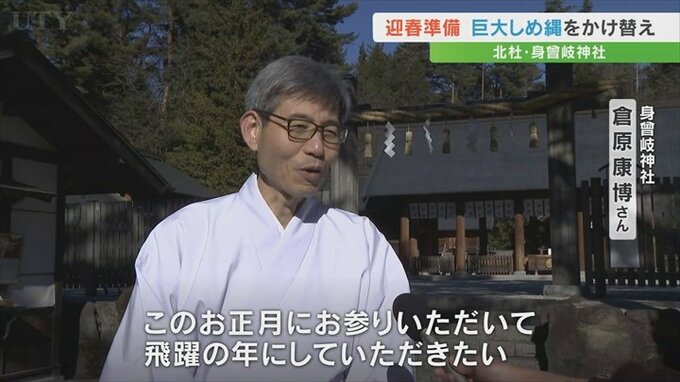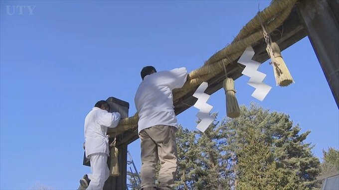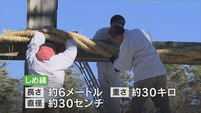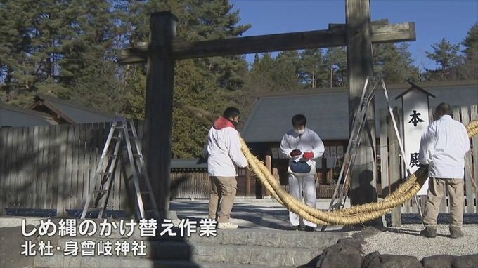 26日は神職ら3人が脚立に登って慎重にしめ縄を持ち上げて縄で固定し、本殿前など6か所のしめ縄をかけ替えました。