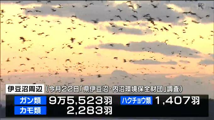 県伊豆沼・内沼環境保全財団が、12月22日に行った調査によりますと、伊豆沼周辺ではガン類が9万5523羽、ハクチョウ類が1407羽、カモ類が2283羽確認されていて、例年並みに飛来が進んでいます。