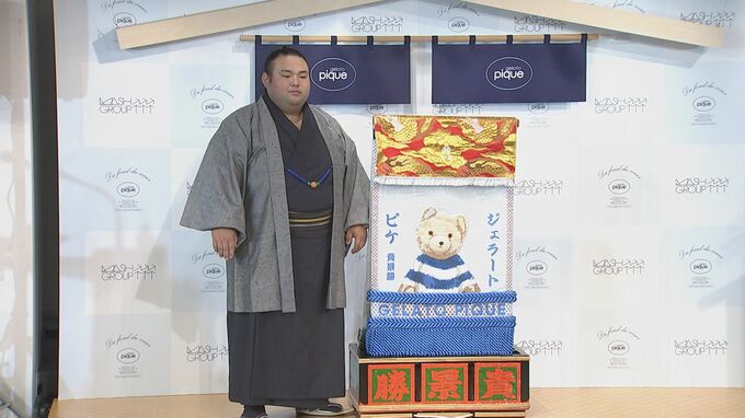「ふわふわ」で「もこもこ」の「ピケベア」のデザインがあしらわれた化粧まわしを前に、貴景勝関は“感動して言葉が出ない。初場所からこの化粧まわしをつけさせていただくので、このまわしに恥じない相撲を取っていきたい”と意気込みを語りました。