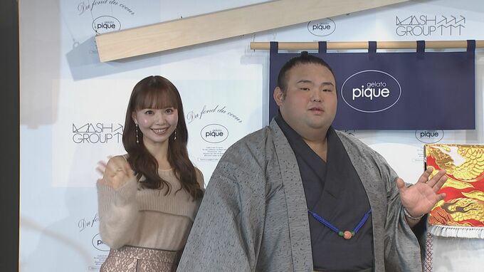 大相撲の大関・貴景勝関と、相撲好き女子「スー女」で知られるタレントの山根千佳さんがルームウェアブランドの「ジェラート ピケ 貴景勝関 化粧廻し贈呈式」に出席しました。