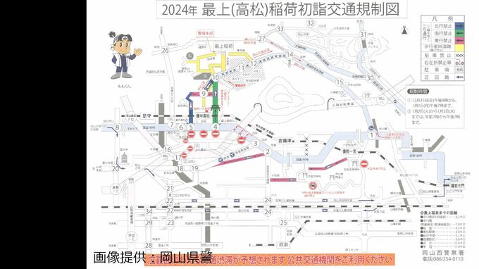 岡山県警は、最上稲荷(岡山市北区高松稲荷)への初詣客で道路の混雑が見込まれることから、交通の安全と円滑を図るため、交通規制を行います。