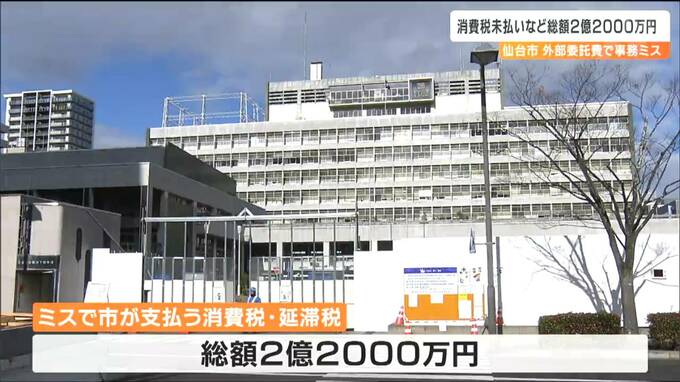 仙台市は、障害者相談支援事業などの外部委託費について、2018年度から今年度の消費税が未払いだったと明らかにしました。この事務ミスによる総額は2億2000万円にのぼり、職員の誤認や確認不足が原因でした。