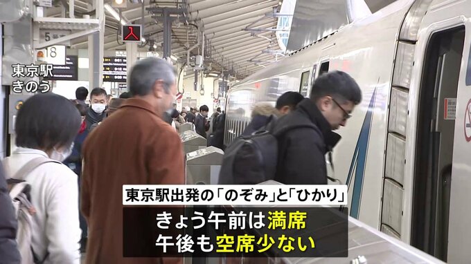 年末年始をふるさとや行楽地で過ごす人たちの帰省ラッシュがきょう、ピークを迎えます。JR東海によりますと、きょう午前に東京駅を出発する「のぞみ」と「ひかり」は満席で、午後も空席が少なくなっているというこ…
