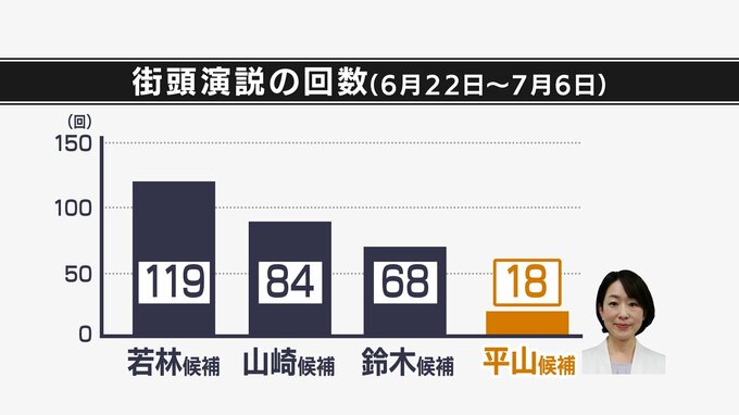 7月6日までの途中の集計なんですけども、公示からこの10何日間の間に、若林候補は119回あったのに対し、平山候補はたったの18回ということで、いかに平山候補が特殊な今回選挙戦を戦ったのかということだと思う