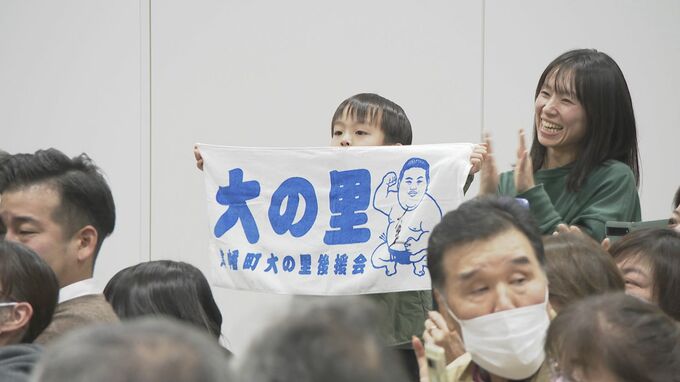 「大の里」と書かれたタオルを掲げた男の子は「(大の里関を)見たかった。楽しかった」と笑顔を見せていました。