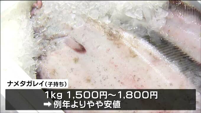 また、仙台の年越しに欠かせないナメタガレイは、子持ちが、1キロあたり1500円から1800円ほどで例年よりやや安値での取り引きとなりました。
