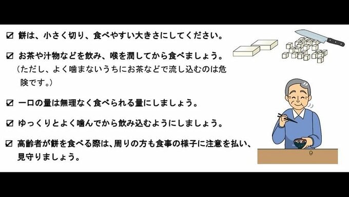 高齢になると、歯の機能が衰えて噛む力が弱くなったり、唾液の量が少なくなって食べた物がスムーズに飲み込みにくくなったりするなどし、窒息のリスクが高くなっているということです。そして、お雑煮などは、正月の機会で久しぶりに食べるなど、ふだん食べ慣れていないので、注意が必要と呼びかけています。
