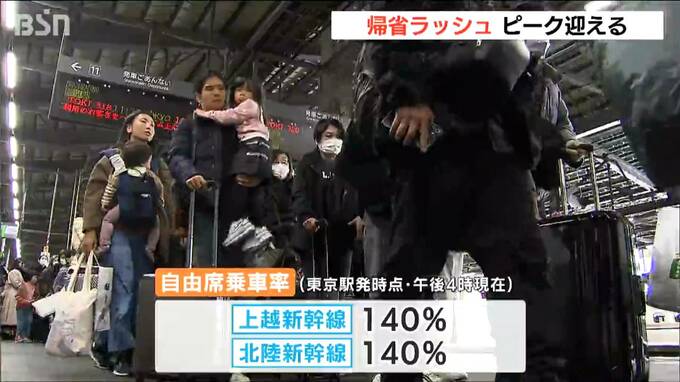 JR新潟駅の新幹線ホームでは大きな荷物を持った人たちが次々と降り立ちました。JR東日本によりますと、東京発の新幹線自由席の乗車率は30日午後4時現在、上越新幹線と北陸新幹線ともに最大で140%となっています。今年は新型ウイルスが5類に移行してから初めての年末年始となります。