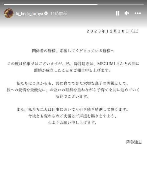 この度は私事ではございますが、私、降谷建志は、MEGUMI さんとの間に離婚が成立したことをご報告申し上げます。