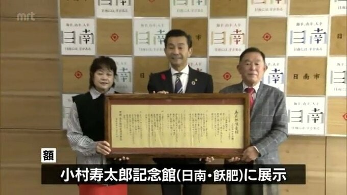 明治の外交官「小村寿太郎」の没後100周年を記念して作られた「寿太郎侯音頭(じゅたろうこうおんど)」の歌詞が入った額が日南市に贈られました。額を贈ったのは寿太郎侯音頭保存会で、日南市役所を訪れた保存会…