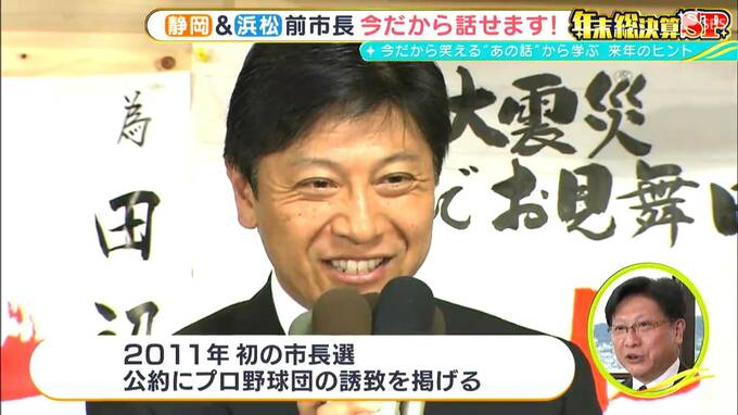 「12年前の私の公約は、政令市になったんだからサッカーだけではなく、プロ野球の球団を静岡市に誘致したい。12年間やらせていただいたおかげで来シーズンから66年ぶりのプロ野球チームが誕生しますし」