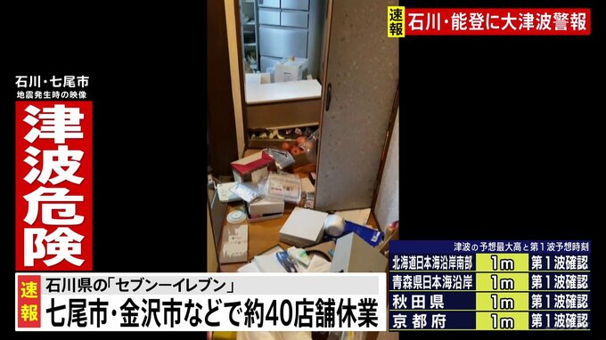 地震によるコンビニエンスストアへの影響です。セブン&アイ・ホールディングスによりますと、セブン-イレブンではきょう午後5時半の時点で、石川県七尾市および金沢市内の店舗を中心に、避難指示に基づき、およそ4…