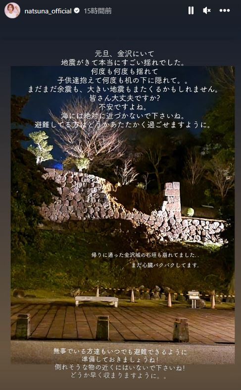 夏菜さんは「元旦、金沢にいて 地震がきて本当にすごい揺れでした。 何度も何度も揺れて子供達抱えて何度も机の下に隠れて。。(※原文ママ)」と、緊迫した状況を明かしました。