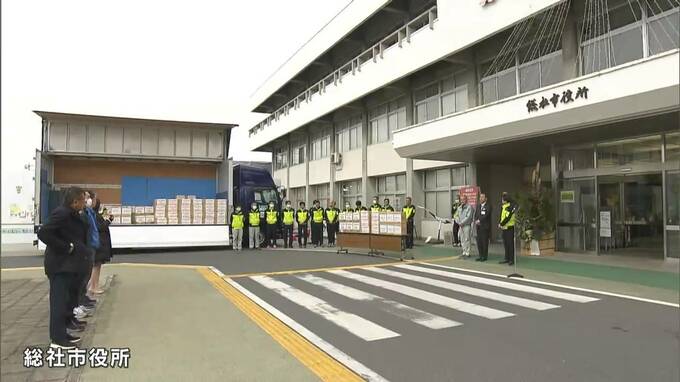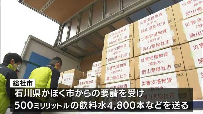 総社市では今回、地震により断水が続いている石川県かほく市からの要請を受けて、500ミリリットルのミネラルウォーター4800本をはじめ、市内の企業や笠岡市から寄せられた飲料水を被災地に届けるということです。