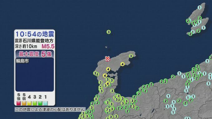 3日午前10時54分ごろ能登地方でマグニチュード5.5の地震がありました。輪島市で震度5強を観測しています。この地震による津波の心配はありません。