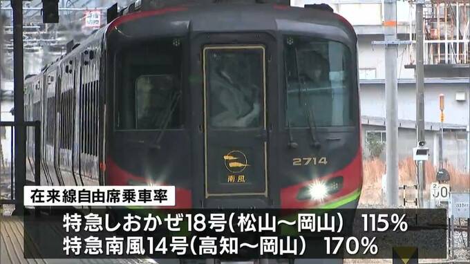 また在来線では、高知発特急南風14号の自由席乗車率が170%となるなど、四国方面からの一部の特急列車では混雑が続いています。