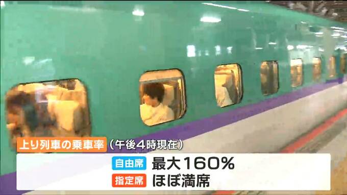JR東日本によりますと、東北新幹線の混雑は3日がピークで、午後4時現在の上り列車の乗車率は自由席が最大160パーセント、指定席はほぼ満席となっています。