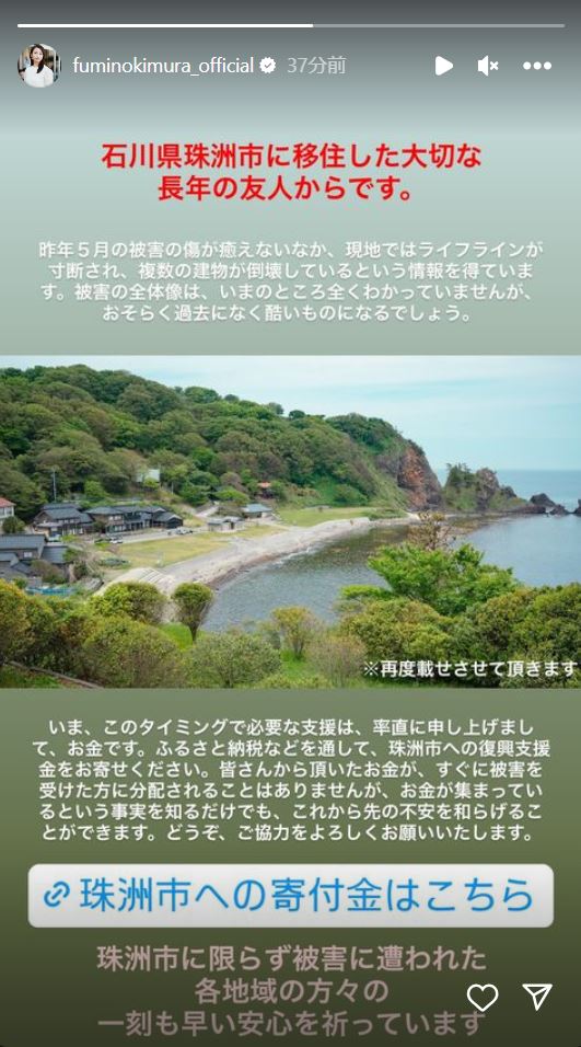 木村さんは、地震の被害に遭う前の珠洲市の海沿いの写真と共に、友人からの言葉を投稿。「被害の全体像は、いまのところ全くわかっていませんが、おそらく過去になく酷いものになるでしょう。」として、「いま、このタイミングで必要な支援は、率直に申し上げまして、お金です。ふるさと納税などを通して、珠洲市への復興支援金をお寄せください。」と率直に呼びかけています。