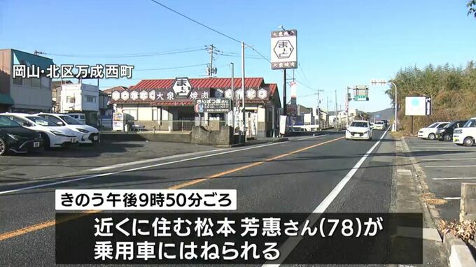 きのう午後9時50分ごろ岡山市北区万成西町の国道180号で、近くに住む松本芳恵ささん(78)が西から走ってきた乗用車にはねられました。