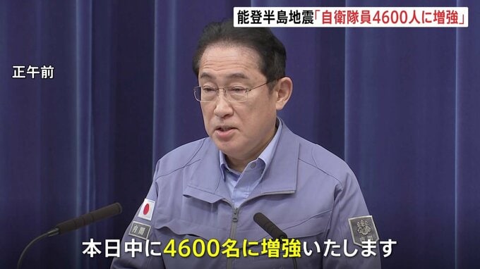最大震度7を観測した能登半島地震を受けて、岸田総理は、対応にあたる自衛隊員をきょう中に4600人へと大幅に増強する方針を明らかにしました。岸田総理「自衛隊の総数は、昨日2000名程度でありましたが、本日中に46…