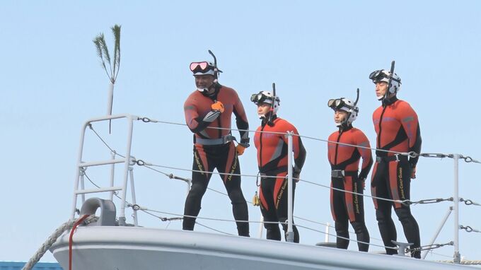 決意表明のあと潜水士たちは次々と船から海へと飛び込み、決意を新たにしていました。