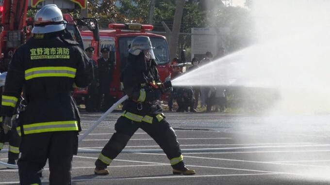 消防職員と消防団員およそ100人が参加し、消防団による放水訓練や地震を想定した消防職員による総合訓練などが披露されました。