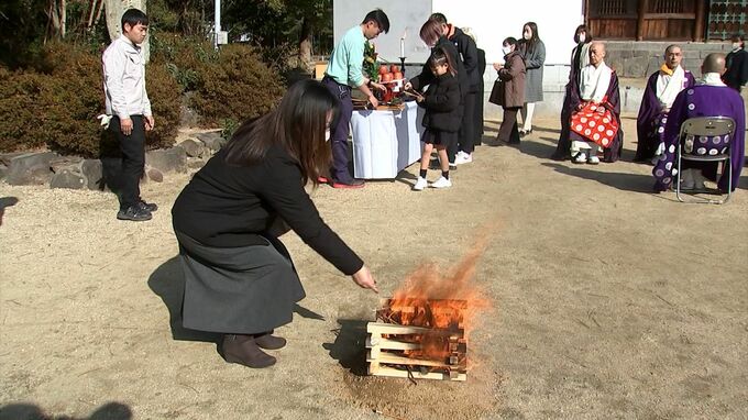 僧侶が読経をあげる中、筆塚の前で焼香し、使ってきた筆を火の中に投げ入れます。中には、親子三代で参加した家族もありました。