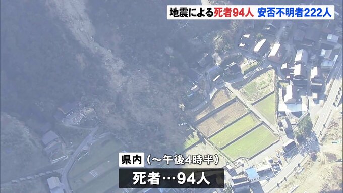 能登半島地震での石川県内の死者は、これまでに94人に上っています。また、県は連絡が取れない安否不明者222人の氏名などを公表しています。地震による県内の死者は、きょう午後4時半までで94人に上っています。内…